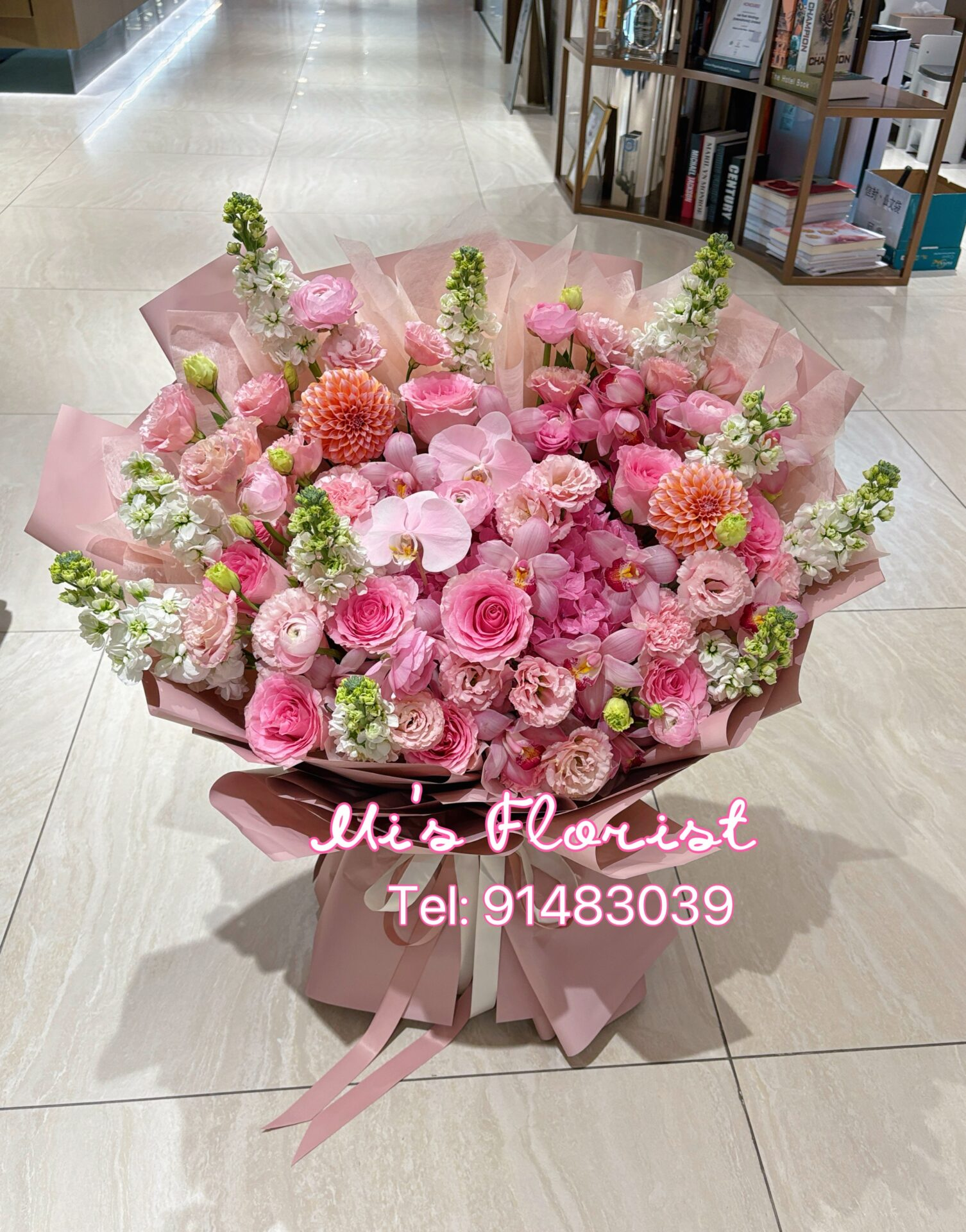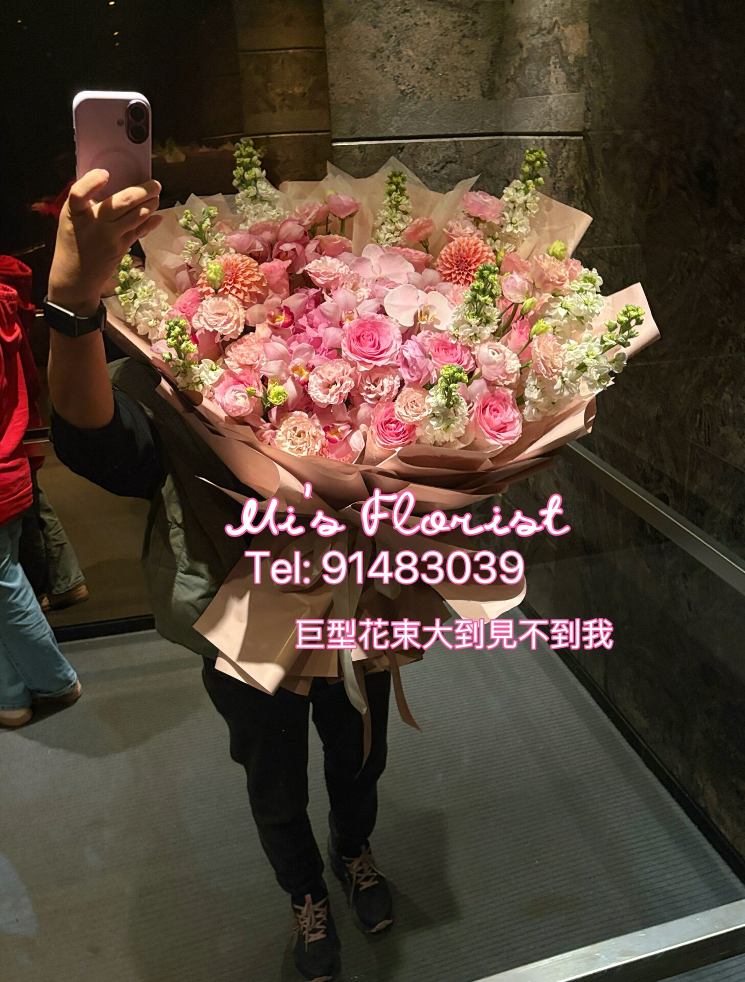 巨型花束 – 粉色系列,繡球花、蝴蝶蘭、玫瑰花、紫羅蘭