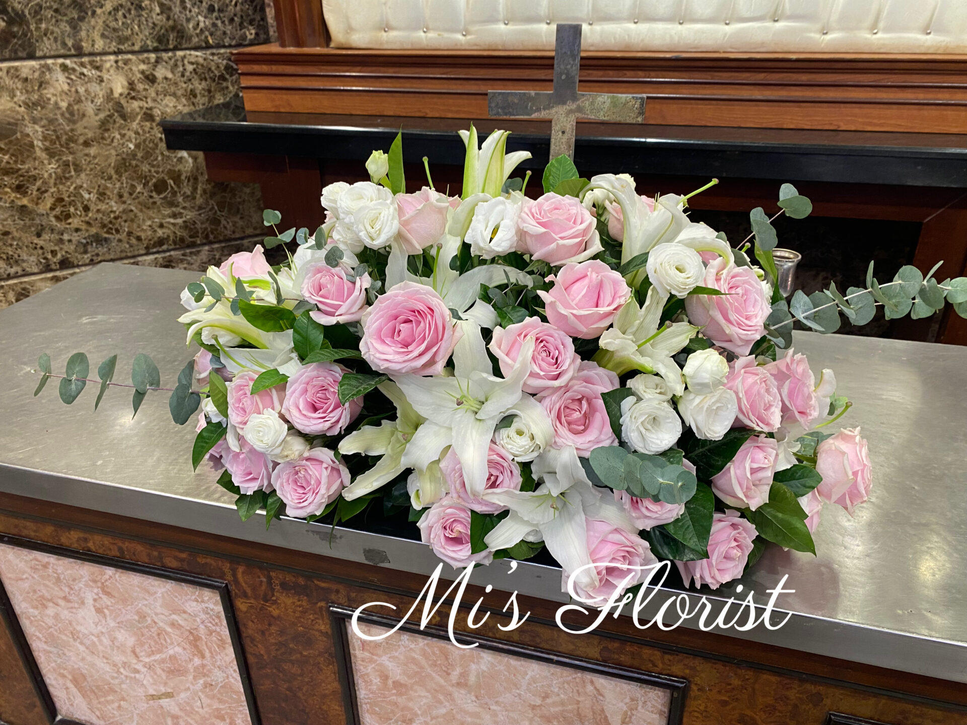 此棺面花由以下花材配襯而成: *白色百合花 *粉雪山玫瑰花 *白色桔梗花 *尤加利葉 *梔子葉
