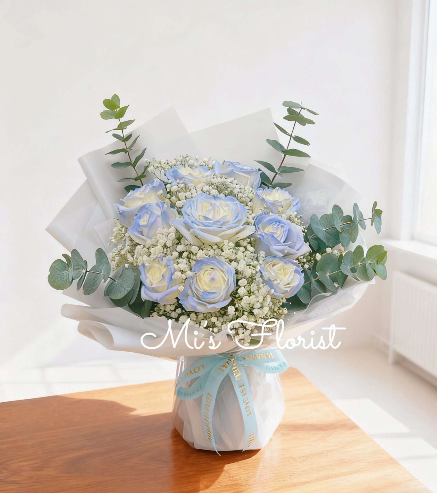 此花束由以下花材組成: *碎冰藍玫瑰花 *白色滿天星 *尤加利葉