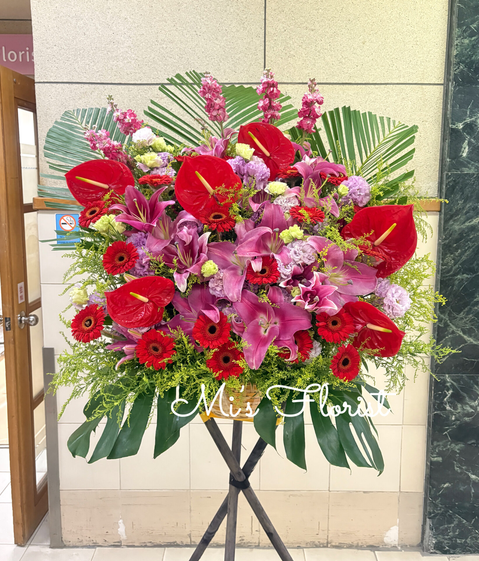 開張花籃 – 紅色百合花 & 紅色太陽菊 & 紅掌