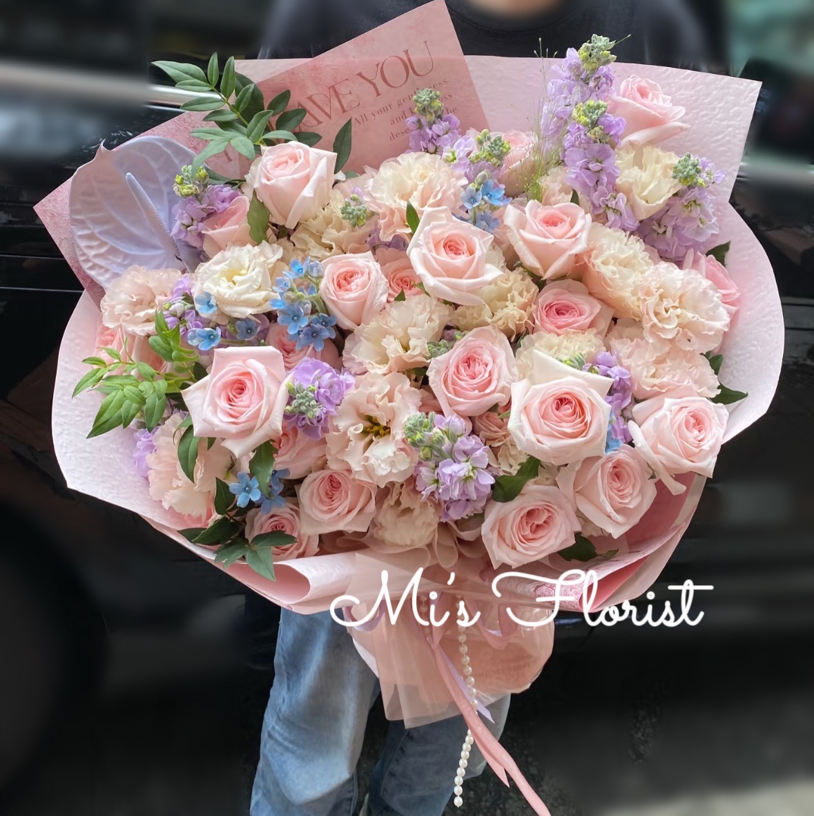 此花束由以下花材組成: *粉色庭園玫瑰花(19-20枝) *粉色桔梗花 *紫色紫羅蘭 *藍星花 *粉紫色掌 *噴泉草 *九星葉