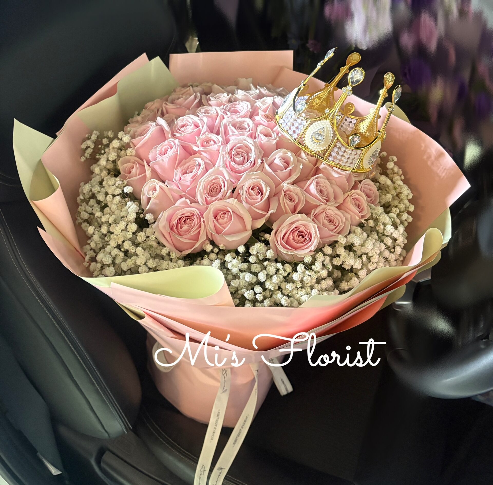 此花束由以下花材組成: 粉雪山玫瑰52枝(戴皇冠) 滿天星